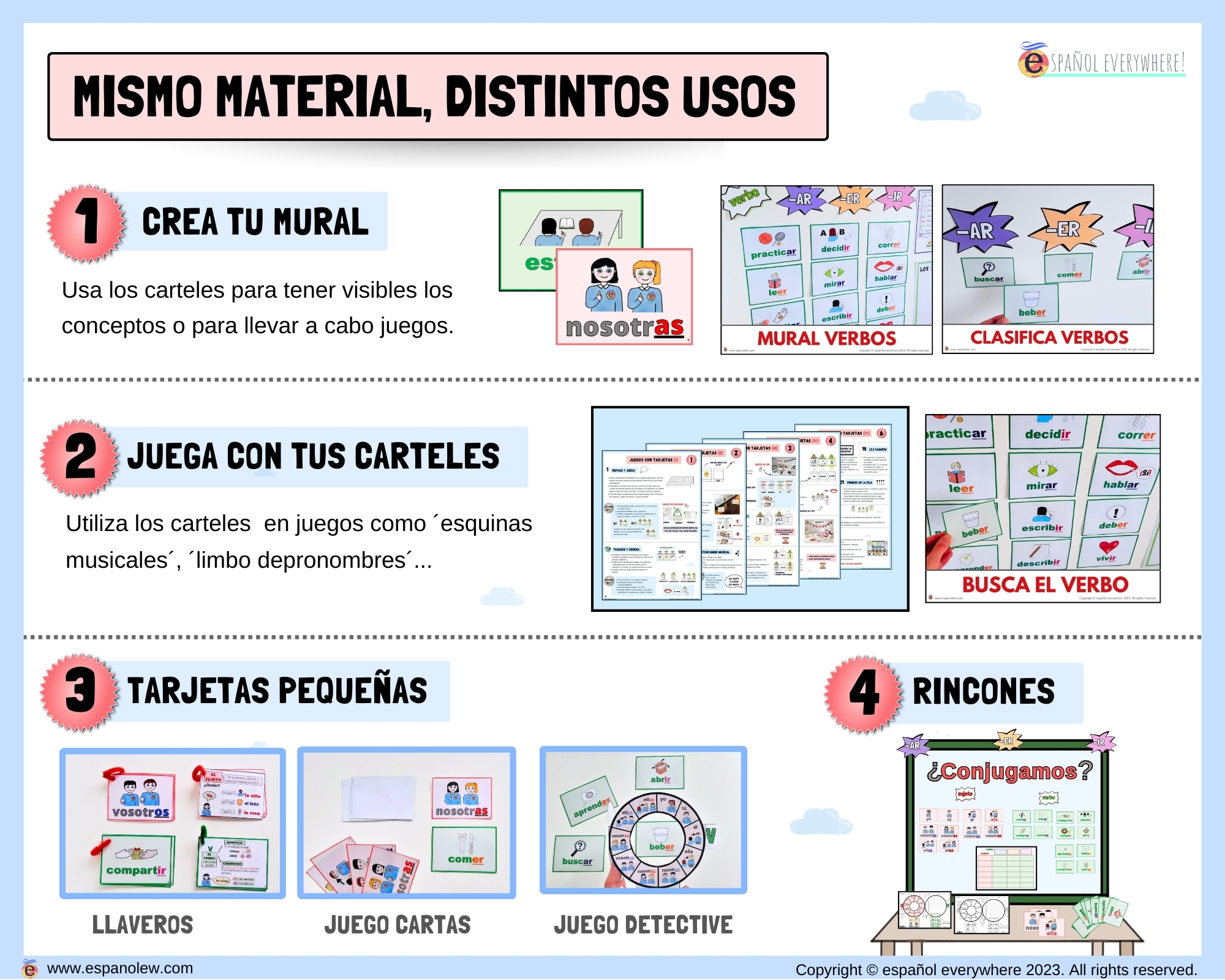💡 Tip práctico: Imprime los carteles grandes (como los de verbos y pronombres que se ven en la foto) en versión más pequeña y usa para llaveros, juegos y rincones. Así amplías las sesiones, fomentas más interacción y no necesitas materiales extra.