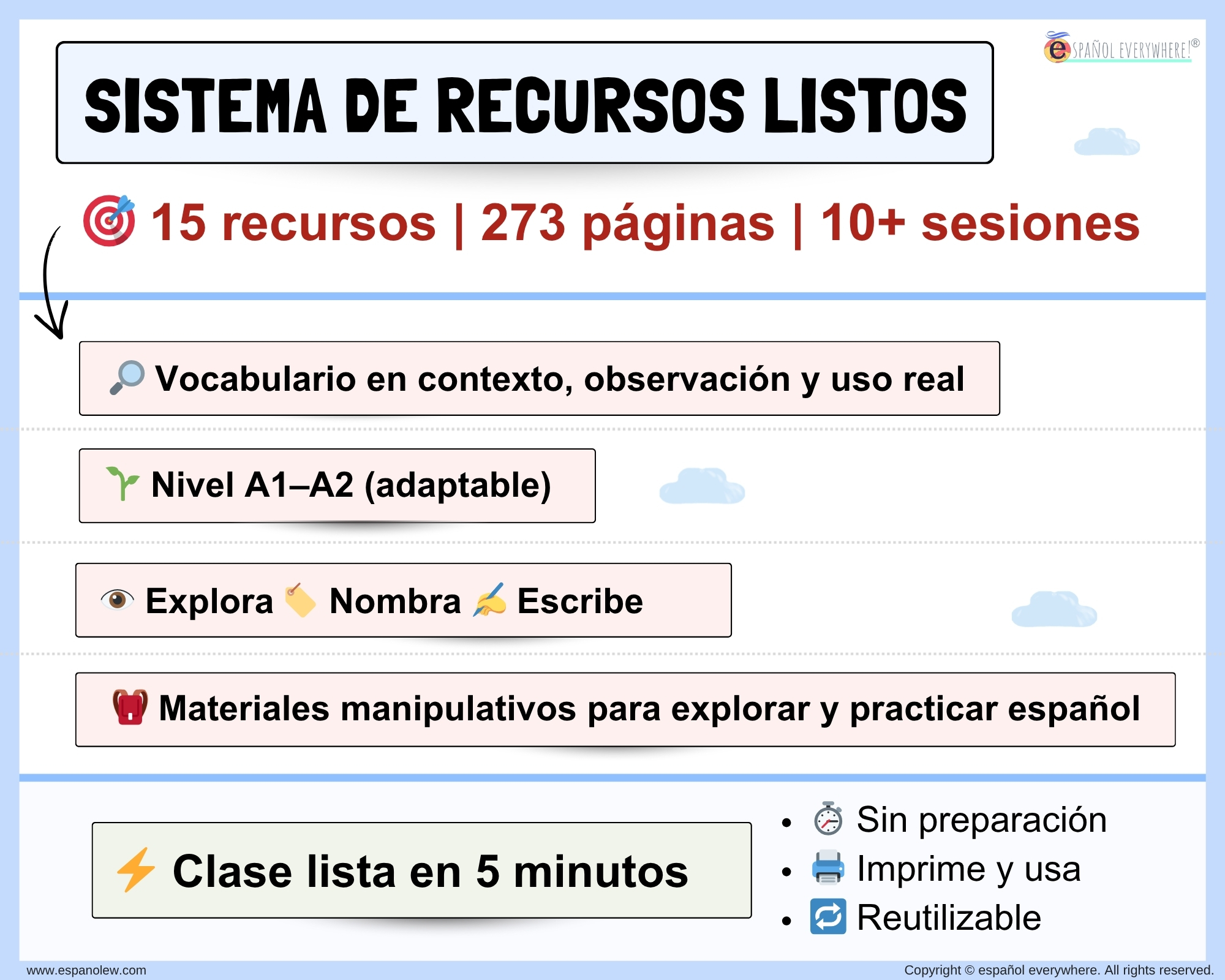👉 No son fichas aisladas, sino un sistema de recursos combinables que puedes adaptar a distintos niveles y reutilizar durante todo el curso.