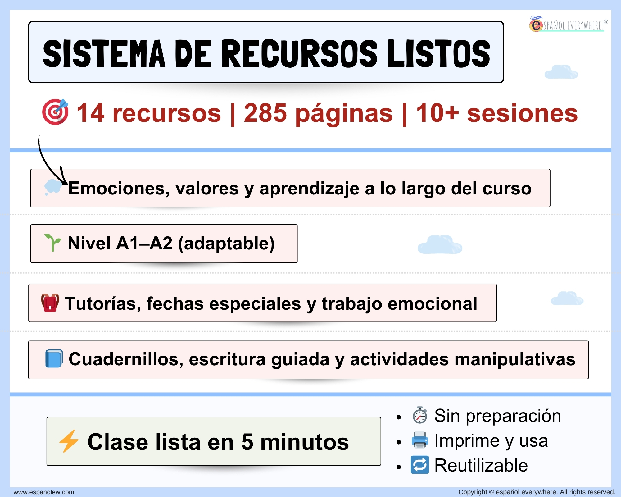 💭 “Quiero trabajar emociones o fechas especiales en clase, pero entre la falta de materiales y el poco tiempo de preparación, acabo improvisando o siento que no consigo crear un proceso de aprendizaje continuo a lo largo del curso.”